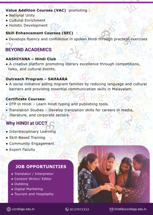 Established in 1944, the Department of Hindi at Union Christian College, Aluva is functioning as an Additional Language Department. The Department takes pride to have grown as a reputable facilitator known for its dedication in teaching Hindi Language and Literature. The Department boasts a rich history, with notable figures such as Prof. N.E.Viswanatha Iyer and Dr.N.Raman Nair, savants of Hindi Literature from South India, having been associated with it. Their presence has added to the Department's prestige and contributed significantly to its academic excellence. Faculty Succession List:- Dr. N E Viswanatha Iyer (26.07.1944 – 31.07.1946) Mr. M G Venkatakrishnan (21.09.1946…